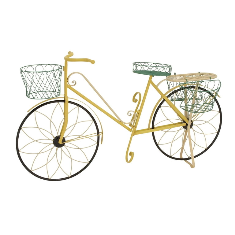 Decmode 54 X 18 X 32 Yellow Metal Indoor Outdoor Scrollwork And Wire Design Bike Plantstand With Basket And Saddle Bag Planters Walmart Com